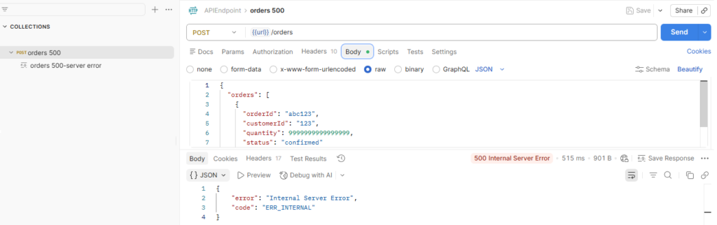 /orderswith payload that triggers server error - Observe 500 Internal Server Error in response.